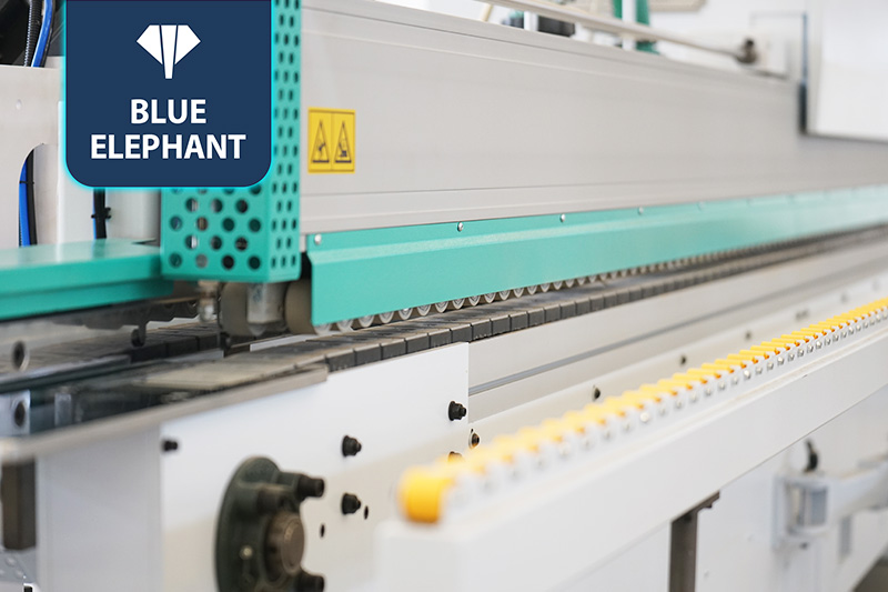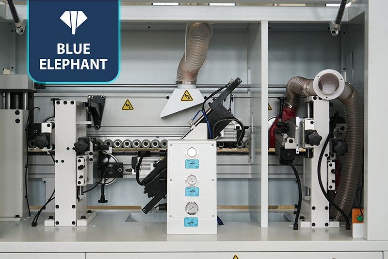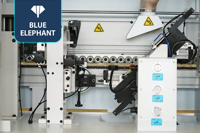 該設(shè)備采用45°斜邊鋸,使直板進入板材進行切割銑型成45°斜邊,通過斜直膠鍋和斜直一體壓貼,使封邊帶與斜直邊板材粘合更緊密。